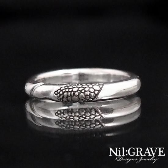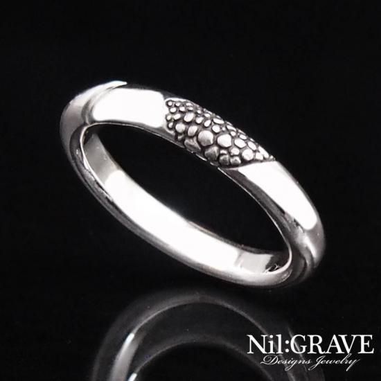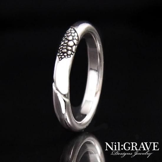シンプルな甲丸形状に鱗調にテクスチャーが彫り込まれたリング。
