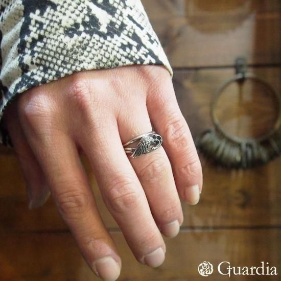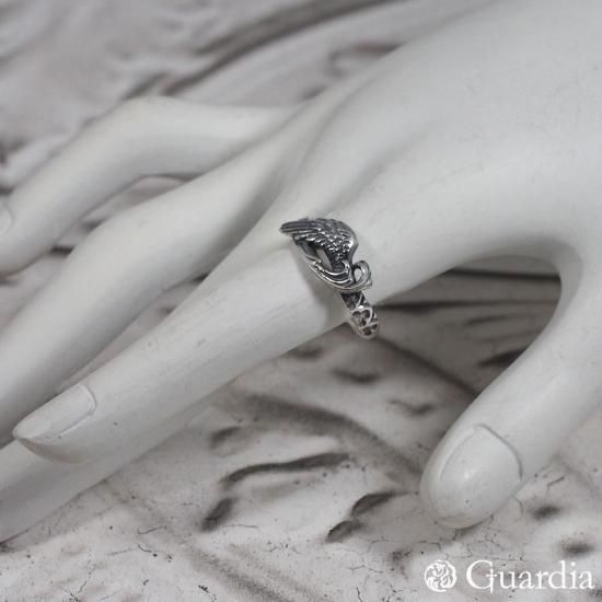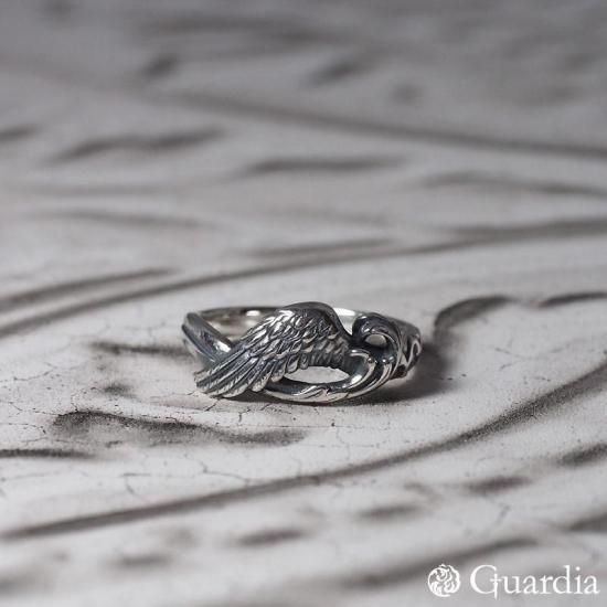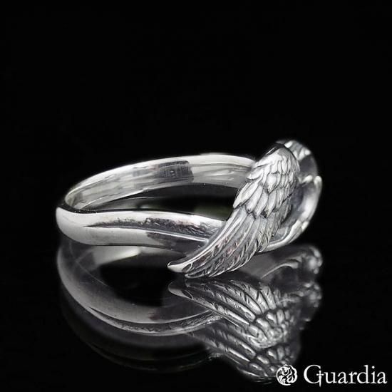 羽と絡むように、唐草と聖堂の薔薇窓の要素も入れており、いろいろな角度から楽しめる曲線美のリング。